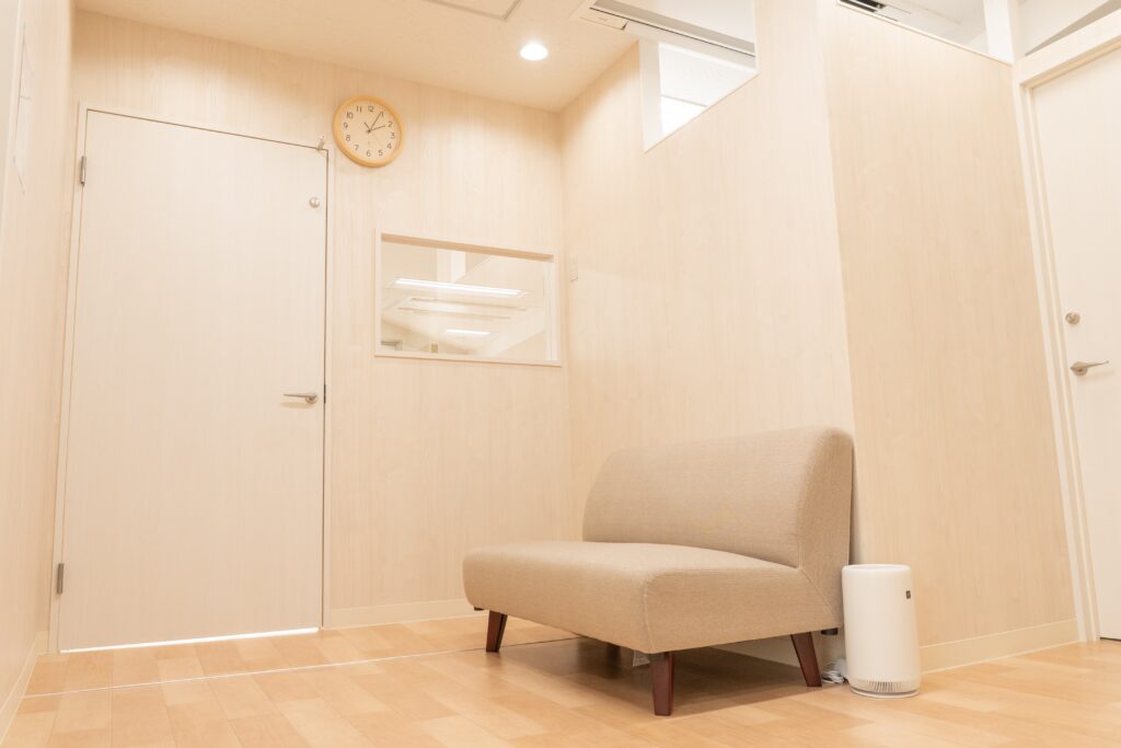 待合室にはソファがあり、ゆったりとお過ごしいただけます。マジックミラー越しに療育室の様子を